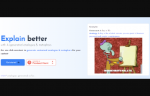 Description: AI-Analogenie is an advanced tool powered by Artificial Intelligence (AI) that helps users write creative analogies and metaphors. The AI algorithms used in AI-Analogenie analyze thousands of concepts and generate unique analogies and metaphors that engage and connect with the intended audience effectively. AI-Analogenie's advanced features include sentiment analysis, ensuring the generated analogies match the desired tone and style. Its natural language generation (NLG) capability provides in-depth and clear analogies, making it an essential tool for content creation and communication. Additionally, the platform's AI-based approach minimizes the risks of plagiarism that could arise from using human-generated analogies and metaphors.