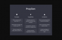 Description: The PrayGen AI Tool is an innovative application that leverages state-of-the-art artificial intelligence algorithms to generate personalized prayers tailored to different occasions and purposes. The tool incorporates relevant verses from religious texts and is specifically trained to decline inappropriate requests. It is designed to help individuals enhance their spiritual journey and connect with a higher power on a deeper level. However, it is important to note that the PrayGen AI Tool also carries some associated artificial intelligence risks, including the occasional generation of incorrect information and a limited knowledge of world events beyond the year 2021. Nonetheless, the tool remains an affordable and accessible option for individuals seeking to improve their daily spiritual practice.