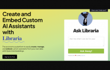Description: Libraria AI Assistant Development Platform is an innovative and autonomous solution designed to facilitate the creation, management, and integration of AI chatbots. With this platform, users can create fully customizable AI assistants from their own data and leverage OpenAI embeddings. The platform offers features such as document import and synchronization, markdown support, and URL syncing, giving users the flexibility to tailor the AI assistant to their specific needs. Additionally, users can rely on a feedback dashboard to continuously improve the assistant over time, ensuring it meets their evolving needs. Libraria offers a range of plans suitable for individuals, teams, and enterprises, making it a flexible solution for organizations of any size. SHORT DESCRIPTION: Libraria is a platform that simplifies the development and integration of AI chatbots, enabling users to create custom assistants from their data, backed by OpenAI embeddings. It features import and sync capabilities, full markdown support, URL syncing, customizable assistants, and a feedback dashboard. With plans for individuals, teams and enterprises, Libraria is a flexible solution suitable for organizations of any size operating in the Chat spectrum.