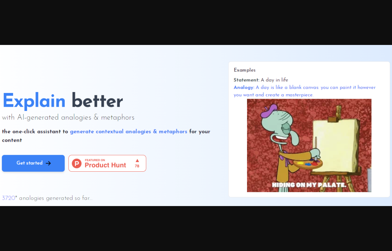 AI-Analogenie is an advanced tool powered by Artificial Intelligence (AI) that helps users write creative analogies and metaphors. The AI algorithms used in AI-Analogenie analyze thousands of concepts and generate unique analogies and metaphors that engage and connect with the intended audience effectively. AI-Analogenie's advanced features include sentiment analysis, ensuring the generated analogies match the desired tone and style. Its natural language generation (NLG) capability provides in-depth and clear analogies, making it an essential tool for content creation and communication. Additionally, the platform's AI-based approach minimizes the risks of plagiarism that could arise from using human-generated analogies and metaphors.