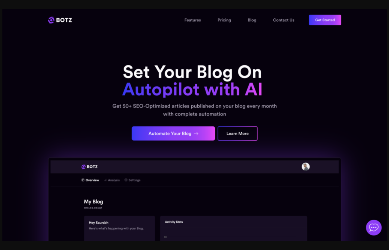 GetBotz is a state-of-the-art blog automation tool that leverages artificial intelligence to facilitate the smooth creation and publication of SEO-optimized articles. It utilizes the latest GPT-3 technology and SEO data to identify relevant keywords, brainstorm article ideas, write compelling articles, and optimize them for readability and search engine visibility. With GetBotz, users can enjoy complete automation of their content creation process, allowing them to focus on other core aspects of their business. Moreover, the tool keeps track of the blog's Google rankings and provides valuable insights into which content performs the best. As with any AI-powered tool, there is a certain degree of risk associated with its use. While GetBotz is designed to minimize the risk of errors and inaccuracies, there is always a chance that the AI algorithm may generate irrelevant or suboptimal content. Nevertheless, the platform has inbuilt features that allow users to manually intervene and tailor the content to their desired specifications.