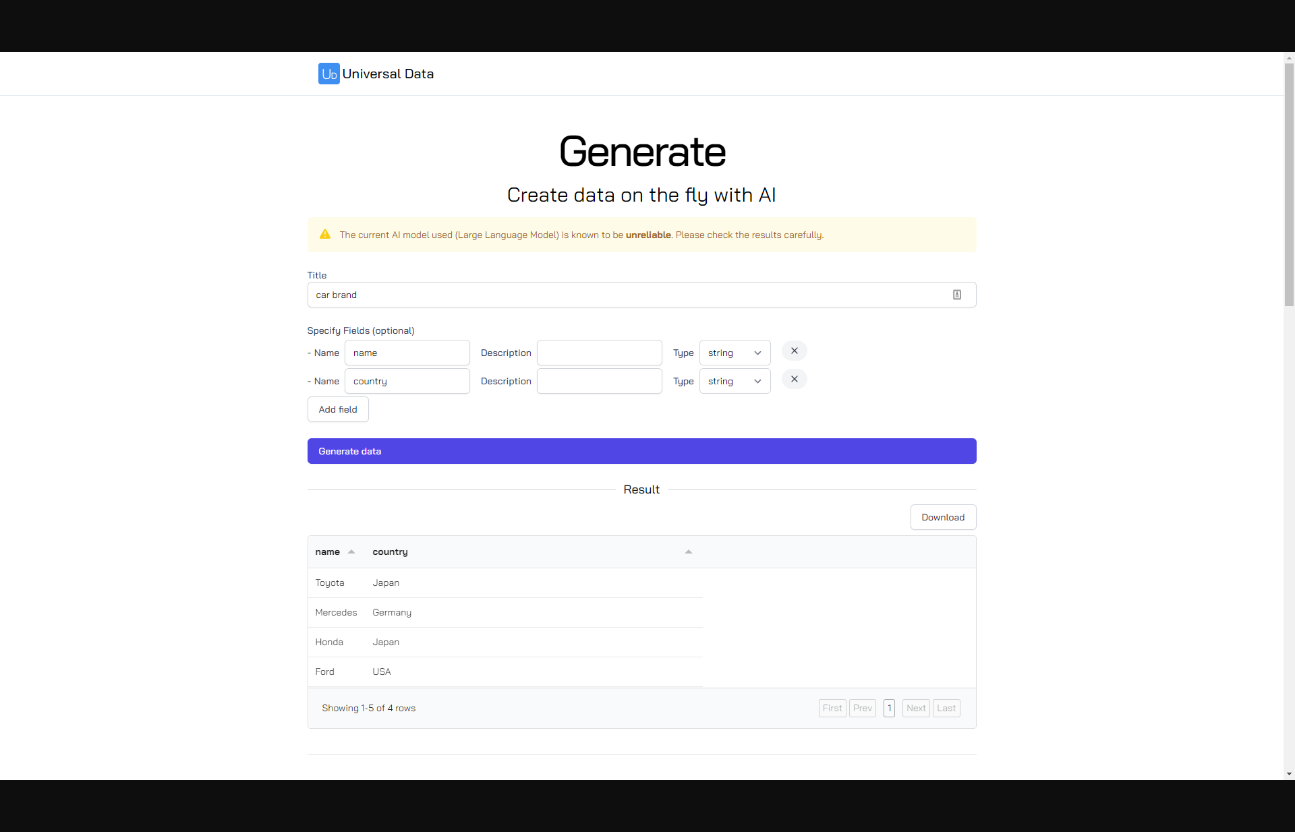 Le générateur de listes de données piloté par l'IA est un outil puissant qui exploite l'intelligence artificielle pour vous fournir des listes de données complètes adaptées à vos besoins et exigences. En entrant une requête, l'outil utilise des algorithmes sophistiqués pour générer une liste de points de données pertinents, vous faisant ainsi gagner du temps et de l'énergie. Que vous cherchiez à compiler une liste de marques de voitures ou une liste des entreprises les plus performantes de votre secteur, le générateur de listes de données piloté par l'IA peut vous aider. En plus de fournir une quantité importante de données, le générateur de listes de données piloté par l'IA prend également en compte le risque associé à l'intelligence artificielle pour garantir que les informations fournies sont précises, fiables et pertinentes pour vos besoins. Avec cet outil, vous pouvez être sûr que les données que vous générez sont de la plus haute qualité et peuvent être utilisées efficacement pour informer vos processus de prise de décision.