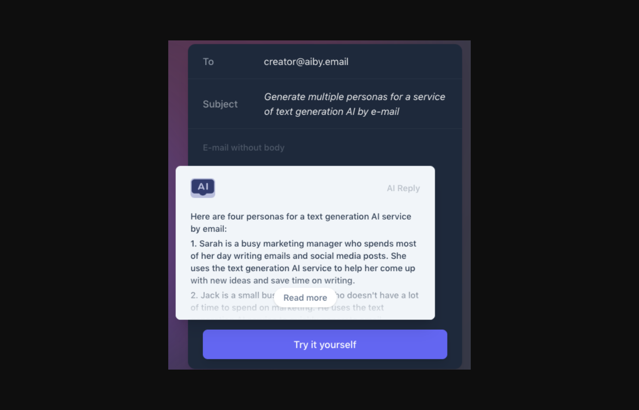 AIby.email est un outil alimenté par l'IA conçu pour vous aider à automatiser les tâches fastidieuses et gagner du temps. Avec ses paramètres d'automatisation personnalisables, AIby.email peut générer des diapositives, du texte, de l'audio, des publicités accrocheuses, des personas, des résumés, des plans d'étude, des contours, des traductions et des résumés, entre autres. Cependant, veillez à faire preuve de prudence lors de la manipulation de données sensibles.