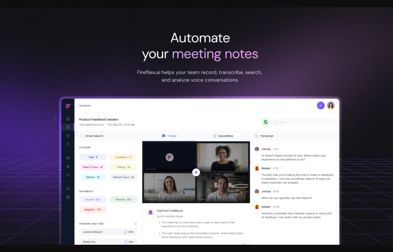 Fireflies AI est l'outil parfait pour automatiser votre processus de prise de notes de réunion. Il enregistre, transcrit et analyse les conversations vocales, générant des transcriptions et d'autres métriques critiques pour aider à la prise de décision. Avec une compatibilité avec diverses applications, fichiers audio et CRM, Fireflies AI est une solution tout-en-un qui répond à vos besoins de productivité. Tout en assurant une sécurité et une confidentialité maximales, vous avez un contrôle total sur l'outil, vous permettant de gérer l'accès aux données et les activités. Essayez-le maintenant pour une expérience de réunion transparente avec des informations et des analyses précieuses.