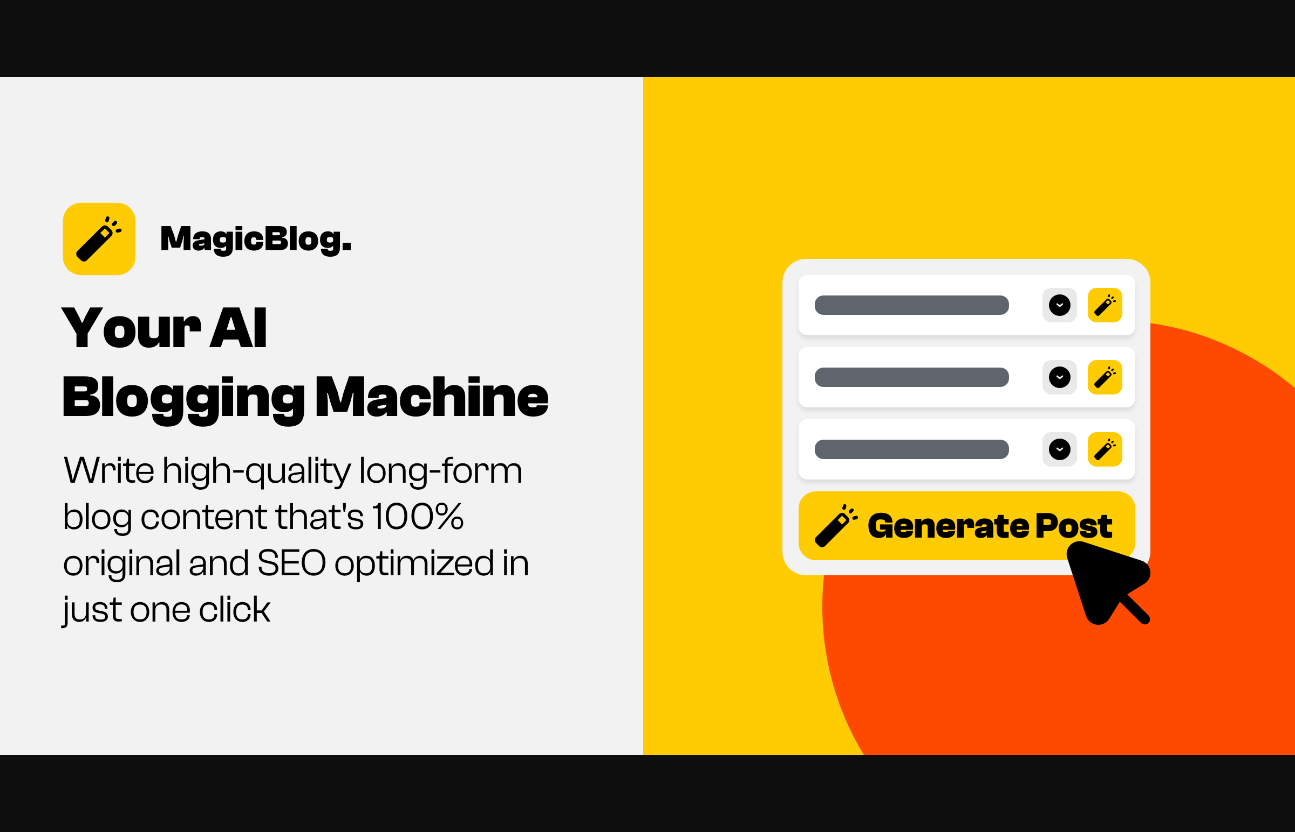 MagicBlog permet aux utilisateurs de générer des articles de blog de haute qualité, optimisés pour le référencement et sans plagiat en un seul clic. Améliorez votre productivité et rationalisez votre processus de création de contenu avec l'algorithme avancé de MagicBlog alimenté par l'IA.