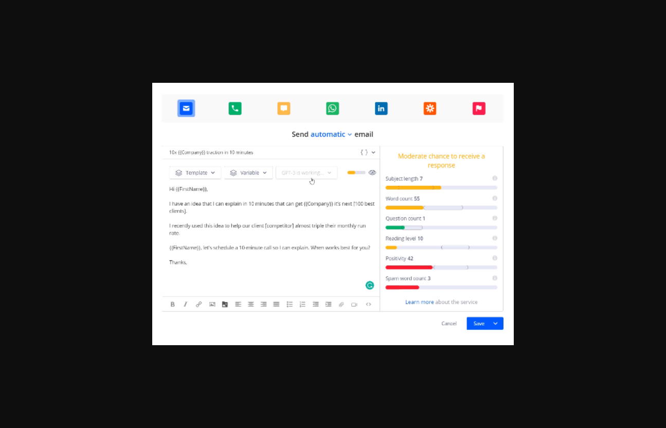 Les courriels étant devenus une partie intégrante des entreprises, des outils de marketing par courriel efficaces ont émergé. L'assistant de courrier électronique de vente de Reply.io est l'un de ces outils de pointe qui utilise l'intelligence artificielle (IA) pour aider les utilisateurs à rédiger des courriels de première étape et de suivi ressemblant à des humains qui les aident à réussir dans leurs efforts de communication par courriel. Conduit par la technologie GPT-3, l'outil alimenté par l'IA analyse habilement les données des clients pour trouver des occasions d'engagement personnalisé et efficace. Reply.io aide à la formulation de courriels 100% réalistes en quelques secondes seulement. La vérification de qualité des courriels de l'outil joue un rôle vital dans l'amélioration de la copie du courriel et l'augmentation des taux d'ouverture et de réponse. L'outil trie efficacement les réponses entrantes en utilisant un algorithme qui utilise la technologie de l'IA pour identifier les occasions chaudes. Reply.io est l'outil parfait pour les entreprises et les spécialistes du marketing qui recherchent l'excellence dans la communication par courriel sans dépasser leur budget marketing.