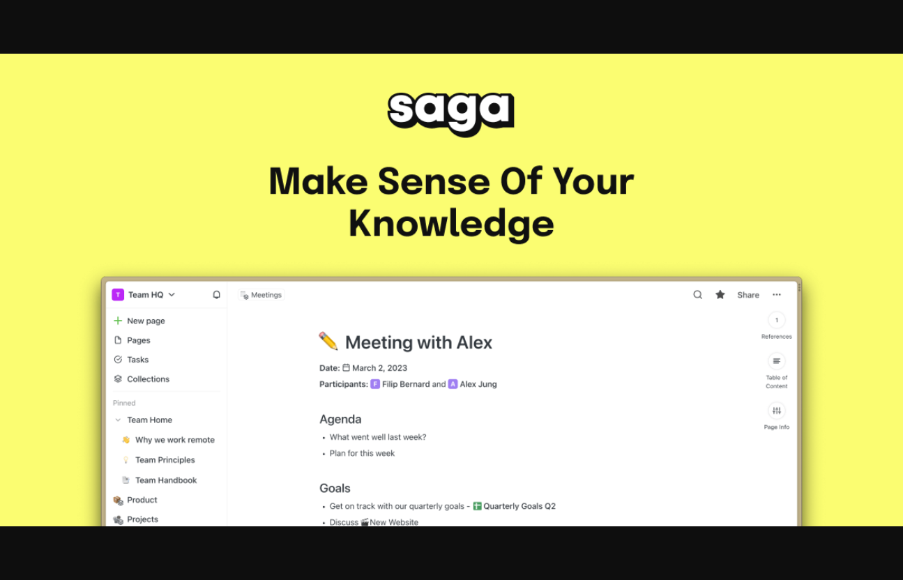 Saga est un outil de productivité qui facilite la gestion de projets et la collaboration en équipe. Avec des fonctionnalités telles que la planification de projet, la gestion de tâches, le suivi des délais et la communication en temps réel, Saga permet aux équipes de travailler ensemble de manière efficace et organisée. Saga est disponible via un abonnement payant. Pour en savoir plus sur Saga, rendez-vous sur https://saga.so