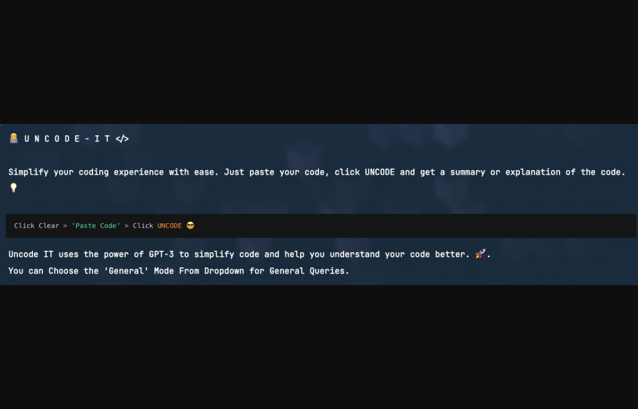 UNCODE-IT est un outil de pointe alimenté par l'IA conçu pour simplifier la programmation en fournissant des résumés clairs et concis et des explications de code complexes. Que vous soyez un développeur chevronné ou un débutant en programmation, UNCODE-IT offre un moyen puissant et intuitif de générer des résumés faciles à comprendre de vos extraits de code à l'aide du modèle linguistique de pointe GPT-3. L'interface conviviale de l'outil permet aux utilisateurs de générer rapidement et facilement des résumés en collant simplement leurs extraits de code et en cliquant sur le bouton UNCODE. De plus, pour des requêtes générales de programmation, les utilisateurs peuvent sélectionner le mode "Général" à partir d'un menu déroulant, ce qui permet encore plus de flexibilité et de commodité. Cependant, il est important de noter que UNCODE-IT comporte également certains risques inhérents à l'IA. Comme pour tout outil d'IA, il y a toujours la possibilité de résultats biaisés ou inexacts, en particulier en ce qui concerne les problèmes de programmation complexes. Il est donc crucial de faire preuve de prudence et de pensée critique lors de l'utilisation de UNCODE-IT , et de toujours vérifier tous les résultats générés par l'outil avant de les utiliser dans des tâches de programmation réelles. Dans l'ensemble, UNCODE-IT est un outil de productivité puissant qui offre une solution innovante et pratique pour les développeurs cherchant à rationaliser leurs flux de travail de programmation. Et le meilleur de tous, il est entièrement gratuit, ce qui le rend accessible aux développeurs de tous les niveaux de compétence. Essayez-le dès aujourd'hui sur le site officiel UNCODE-IT : https://uncode.vercel.app