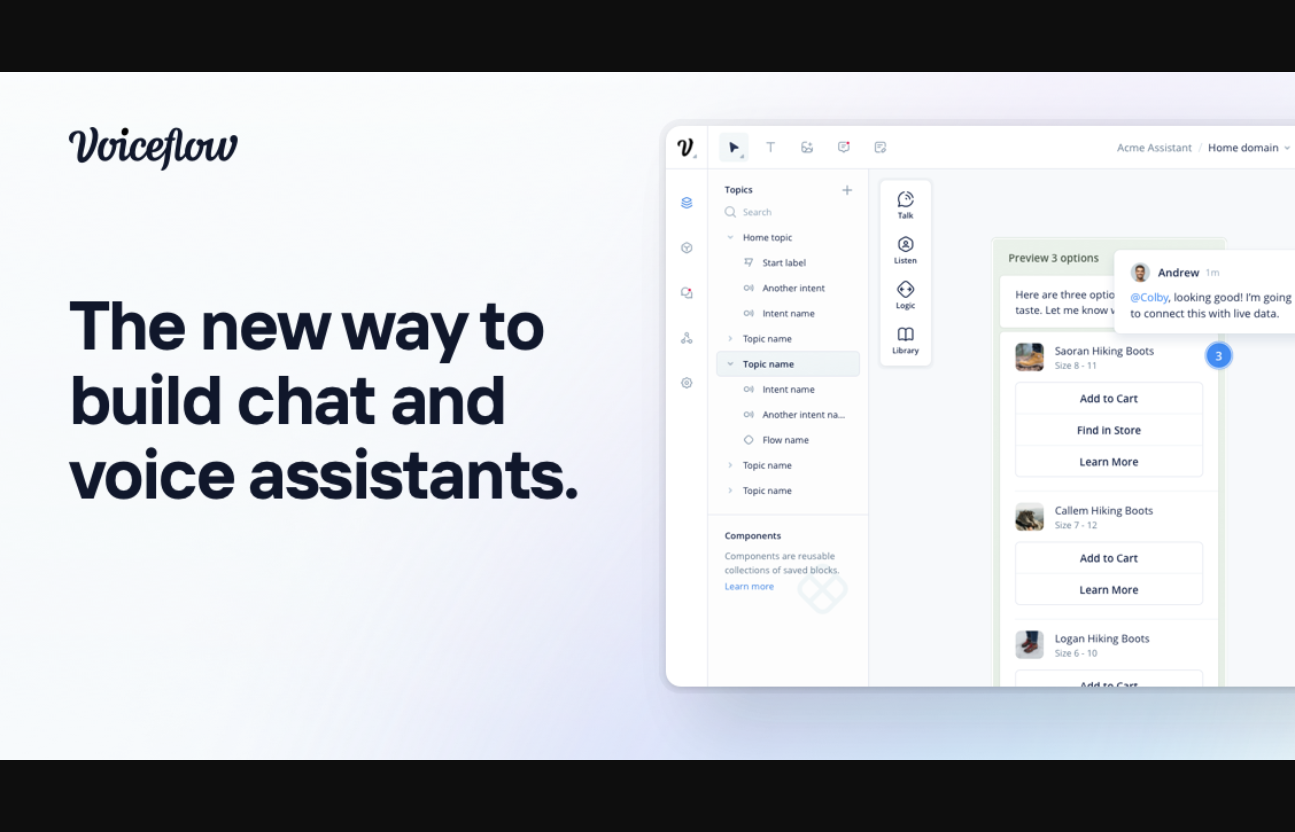 Voiceflow est un outil avancé d'IA qui rassemble les équipes pour créer rapidement et efficacement des assistants de chat et de voix. Avec la conception glisser-déposer de Voiceflow, les concepteurs de conversation, les propriétaires de produits et les développeurs peuvent collaborer facilement en un seul endroit pour créer des expériences conversationnelles dynamiques et interactives. La plateforme offre un prototypage rapide, une rétroaction en temps réel, du code pré-construit, des composants et des modèles réutilisables, ainsi qu'un ensemble complet de fonctionnalités pour garantir le chatbot parfait. Cependant, il est important de prendre en compte les risques liés à l'utilisation de l'intelligence artificielle dans les chatbots. Ainsi, Voiceflow propose un guide complet pour garantir des pratiques éthiques et responsables lors du déploiement de chatbots. Que vous créiez un chatbot pour le support client, la génération de leads ou d'autres objectifs, la plateforme Freemium conviviale de Voiceflow vous facilitera la création d'expériences conversationnelles innovantes.