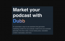 Description: Dubb is an innovative AI-powered tool that caters to the needs of podcasters. Dubb's AI algorithm generates engaging marketing content from podcast episodes, such as show notes, social media posts, newsletter content, and transcripts. Dubb's automation maximizes podcasters' productivity by reducing the time and effort required to create marketing content across different platforms. Dubb has three pricing plans to suit different budgets, including an Enterprise plan that offers up to 100+ hours of podcast audio turned into captivating marketing content. With Dubb, podcasters can elevate their marketing strategies to unprecedented heights and grow their audience quickly. Try Dubb for free today and witness the difference it makes! SHORT DESCRIPTION: Dubb is an AI-powered Podcasting tool that simplifies content creation. Dubb's automated assistant generates captivating marketing content from podcast episodes like show notes, transcripts, social media posts, and newsletter content, enhancing podcasters' engagement and productivity. Dubb offers three pricing options, including an Enterprise plan with up to 100+ hours of podcast audio automatically turned into appealing marketing content. Try Dubb today and discover how it can revolutionize your marketing strategies!