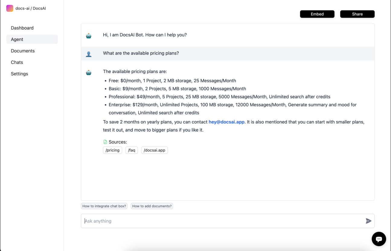 DocsAI is a revolutionary AI-based support agent developing tool. The tool serves as an AI-based chat agent builder for websites and Slack integration, providing an efficient solution for customer support and HR department’s requirement. The tool lets users add websites and train the bot by adding text to it. DocsAI allows users to ask questions to test the chatbot and embed it on their website with a single code line. Besides, it provides a summarized report on the conversation's insights. Users can integrate the tool with Slack, as the tool is designed to streamline communication in an organization. While the tool comes with Freemium pricing, it provides high-end features, making it an ideal choice for businesses of all types, including small to large enterprises. Yet, it is essential to consider the associated artificial intelligence risks before integrating the tool to the business model. The use of AI comes with specific risks to data confidentiality, privacy, and accuracy, requiring the business to conduct in-depth risk assessments to ensure that the AI tool aligns with business objectives and risk limits.