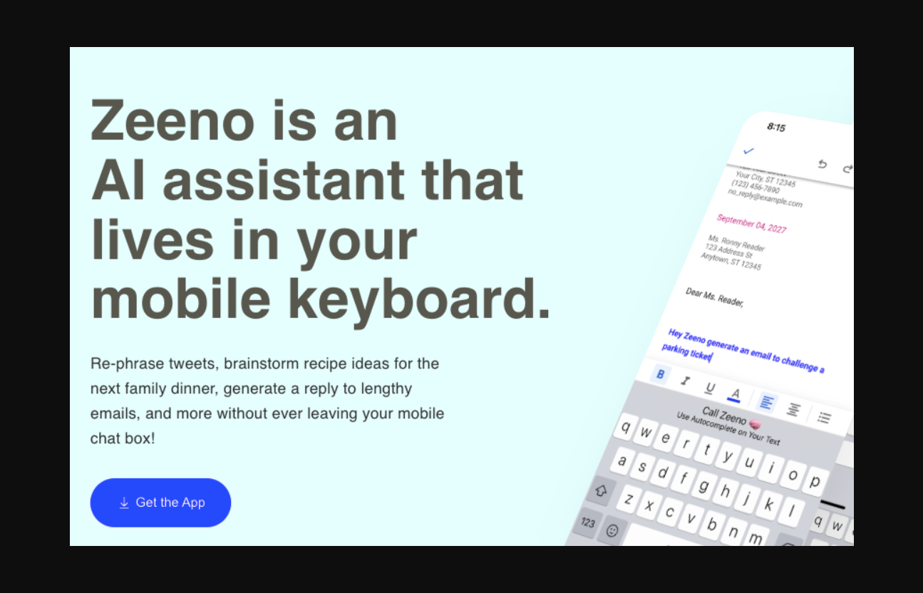 Zeeno AI is an app that brings AI-assisted productivity to your mobile keyboard, enabling you to generate replies to emails, brainstorm recipe ideas, re-phrase tweets, and do research in-chat. Keep your data safe and secure with robust security protocols while enjoying the powerful capabilities of Zeeno AI for free. Get started today by going to your keyboard settings and adding 'AiKeyboard.'