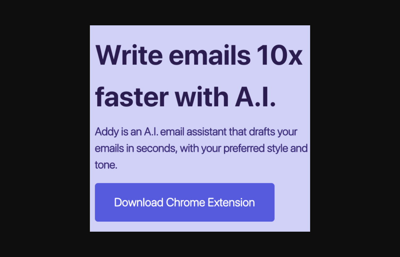 Addy AI est un puissant assistant de messagerie alimenté par l'IA qui permet aux utilisateurs de rédiger rapidement des e-mails professionnels en utilisant leur style et ton d'écriture préférés. Avec son interface facile à utiliser, les utilisateurs peuvent gagner du temps et augmenter leur productivité en rationalisant leurs flux de travail de messagerie électronique et en se concentrant sur des tâches à haute valeur ajoutée. Addy AI est disponible en tant qu'extension Google Chrome et est proposé en tant qu'outil de productivité payant. Visitez https://addy-ai.com pour en savoir plus sur la façon dont Addy AI peut vous aider à prendre le contrôle de votre gestion de messagerie électronique.