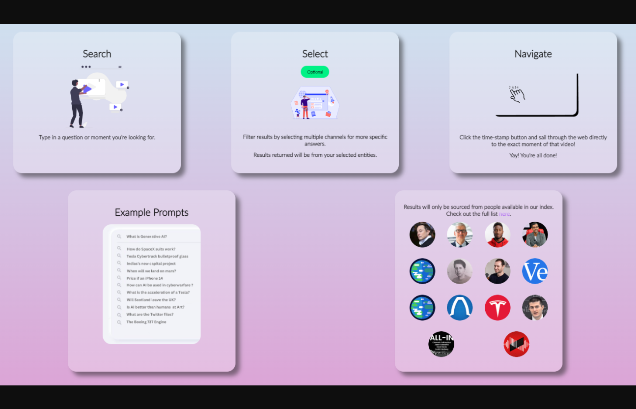 AI Discover est un moteur de recherche alimenté par l'IA pour YouTube qui filtre les résultats par chaînes et fournit des horodatages pour des résultats précis. Il permet aux utilisateurs de rechercher des réponses dans une vaste bibliothèque de vidéos et de podcasts YouTube, rendant la recherche sur YouTube plus efficace et sans faille. AI Discover est gratuit et mis à jour chaque semaine et comporte des risques d'intelligence artificielle dont les utilisateurs doivent être conscients lorsqu'ils utilisent la plateforme. Essayez AI Discover dès aujourd'hui sur https://exploreai.vercel.app.