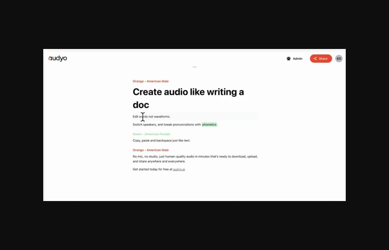 Audyo est un outil de synthèse vocale de pointe alimenté par l'IA qui permet aux utilisateurs de créer et de personnaliser des voix d'IA de qualité humaine à partir d'un simple processus de saisie de texte. Avec Audyo, les utilisateurs peuvent s'attendre à une expérience audio optimale sans avoir besoin de comédiens professionnels. Inscrivez-vous avec votre compte Google pour commencer à utiliser cet outil avancé convivial.