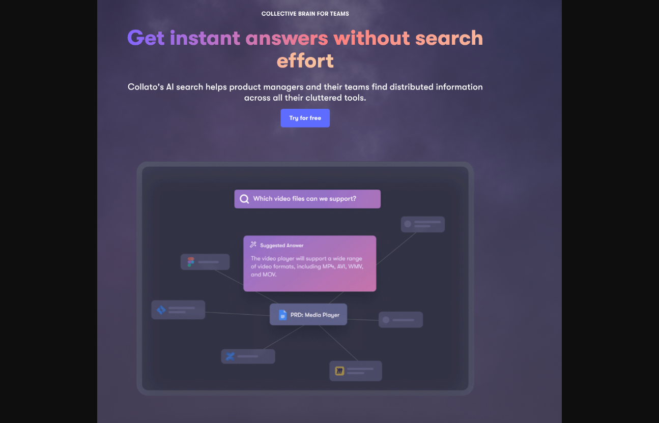 Collato AI est un outil de recherche innovant qui rationalise le processus de recherche de produits et économise des ressources précieuses pour les équipes de produits. Avec une technologie avancée d'IA et des techniques d'apprentissage automatique, il combine les données dispersées sur les produits et élimine les silos d'information pour fournir des réponses instantanées et des résumés générés automatiquement. Compatible avec le règlement GDPR, Collato AI est l'outil de productivité idéal pour rendre la recherche productive et efficace. Commencez dès aujourd'hui avec Collato AI sur https://collato.com.