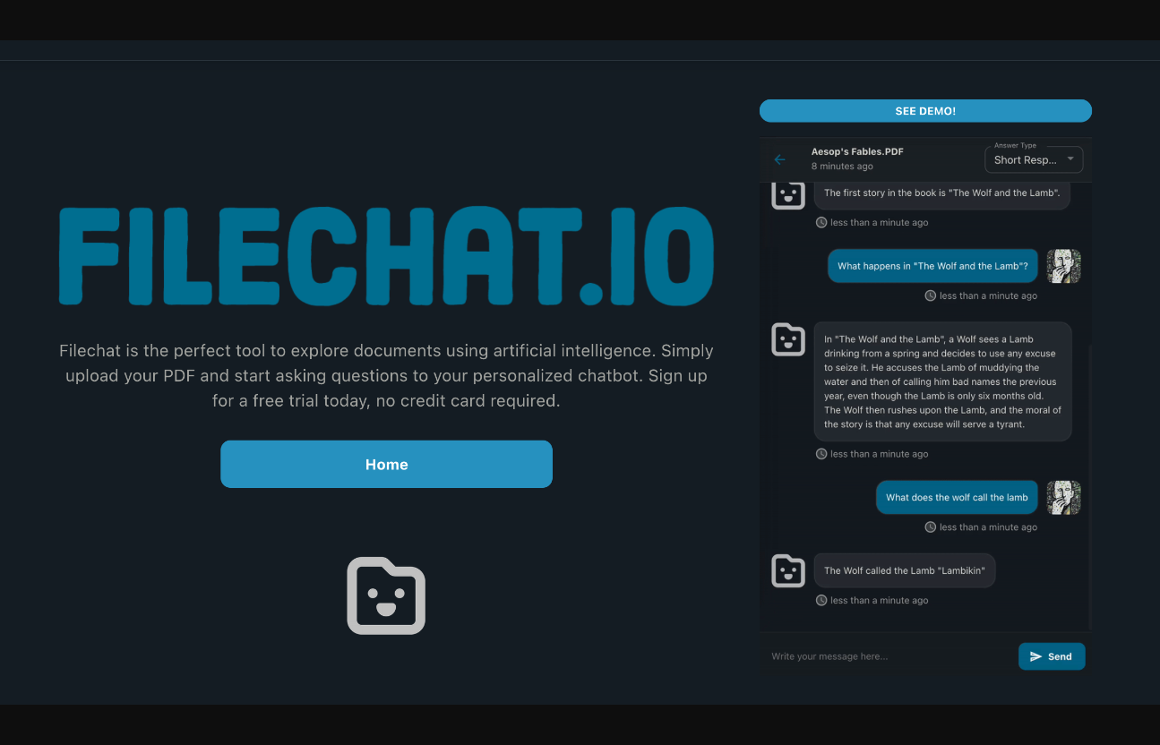 Filechat.io est un outil de chat alimenté par l'IA qui permet aux utilisateurs d'explorer efficacement une large gamme de documents. Les utilisateurs peuvent télécharger divers documents et poser des questions auxquelles le chatbot personnalisé répondra. De plus, l'outil offre des options de stockage en nuage avec des mesures de sécurité strictes en place. Filechat.io offre un essai gratuit et divers plans d'abonnement payants pour accéder à toutes les nouvelles fonctionnalités.