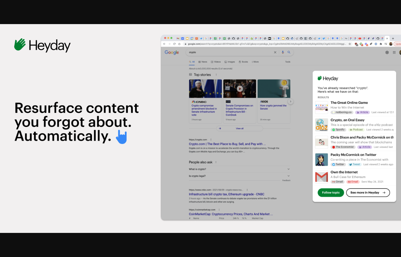 Heyday AI Memory Boost est un outil sophistiqué alimenté par des technologies d'apprentissage automatique et d'IA qui a été développé pour aider les gens à rappeler rapidement des informations vitales découvertes pendant la navigation sur le Web. L'outil aide efficacement les individus à se souvenir de plus de ce qu'ils trouvent sur Internet. Il capture et enregistre automatiquement les pages Web visitées, puis les affiche à côté des résultats de recherche, des messages, des documents, des newsletters, des notes, des présentations, des feuilles de calcul, des tweets, des fichiers et plus encore. Heyday AI Memory Boost est conçu pour fonctionner comme un produit sécurisé et privé, et il peut être facilement ajouté à votre navigateur avec une configuration rapide et facile. Cependant, comme avec tout outil alimenté par l'IA, le risque associé à l'intelligence artificielle doit être pris en compte avant utilisation.