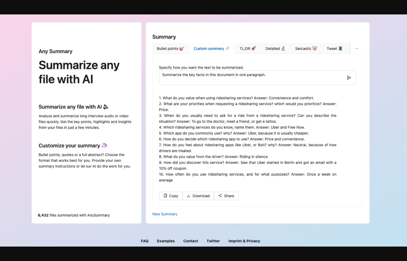 Une plateforme qui utilise l'IA pour générer des résumés concis de différents types de contenu.