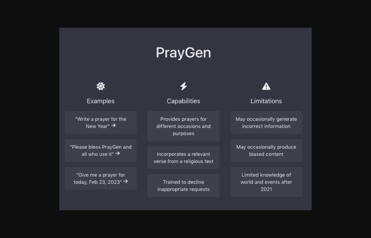 L'outil AI PrayGen est une application innovante qui utilise des algorithmes d'intelligence artificielle de pointe pour générer des prières personnalisées adaptées à différentes occasions et purposes. L'outil intègre des versets pertinents des textes religieux et est spécifiquement entraîné à décliner les demandes inappropriées. Il est conçu pour aider les individus à améliorer leur cheminement spirituel et à se connecter avec une force supérieure sur un niveau plus profond. Cependant, il est important de noter que l'outil AI PrayGen comporte également certains risques associés à l'intelligence artificielle, notamment la génération occasionnelle d'informations incorrectes et une connaissance limitée des événements mondiaux au-delà de l'année 2021. Néanmoins, l'outil reste une option abordable et accessible pour les personnes souhaitant améliorer leur pratique spirituelle quotidienne.