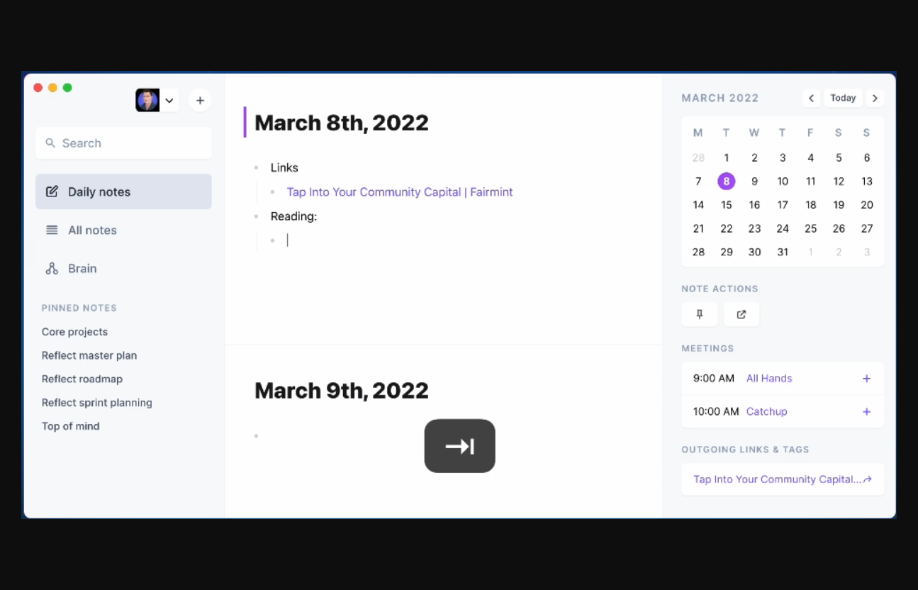 L'outil AI Reflect est la solution idéale pour les utilisateurs souhaitant augmenter leur productivité lors de la prise de notes. Cet outil de pointe facilite la capture de vos idées de manière transparente, quel que soit l'appareil que vous utilisez. Grâce à son intégration de chiffrement de bout en bout, vos notes sont toujours protégées des regards indiscrets, tandis que la fonctionnalité d'intégration de calendrier vous garantit de ne jamais manquer une échéance. De plus, la fonction de recherche sans friction vous permet de trouver instantanément vos notes en utilisant des mots-clés, rendant la prise de notes plus efficace et moins chronophage. En outre, Reflect intègre les dernières technologies d'intelligence artificielle pour améliorer votre expérience de prise de notes grâce à une organisation, des suggestions et un formatage automatisés. Les utilisateurs peuvent également partager leurs notes facilement en un clic. SHORT DESCRIPTION: L'outil de prise de notes essentiel assisté par l'AI Reflect est un outil de prise de notes de pointe qui rationalise le processus de capture d'idées et leur organisation en temps réel, grâce à son intégration d'AI et sa synchronisation transparente sur tous vos appareils. Conçue pour être efficace, Reflect propose des fonctionnalités de chiffrement de bout en bout, d'intégration de calendrier, de recherche sans friction et de partage facile. Toutes ces fonctionnalités en font l'outil ultime pour la prise de notes qui vous fait gagner du temps, vous évite les tracas et améliore votre productivité.