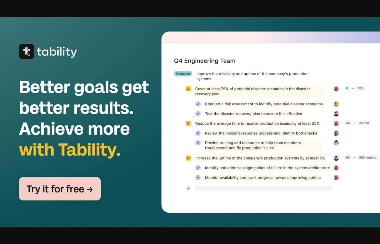 Tability est un outil de productivité innovant qui tire parti de l'intelligence artificielle pour aider les équipes à définir et suivre efficacement les objectifs à l'aide des OKR. Ses fonctionnalités comprennent la définition d'objectifs sans faille, le suivi, la surveillance des progrès et l'alignement des efforts sur les initiatives et les tâches. Avec des rapports à la demande, une personnalisation flexible et une intégration avec d'autres outils populaires, Tability est un puissant stimulateur de productivité. De plus, l'outil fournit des ressources précieuses telles que des modèles et des exemples d'utilisation d'OKR, permettant aux équipes de tirer plus facilement des informations de leurs OKR et de suivre les progrès. Cependant, il est essentiel de noter que, comme tous les outils alimentés par l'IA, Tability soulève certains risques associés à l'intelligence artificielle. Comme pour tout outil alimenté par l'IA, il est crucial d'utiliser Tability avec soin et avec une attention particulière aux risques impliqués.