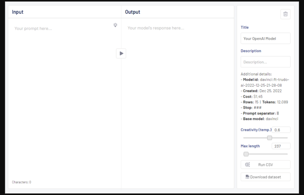 Trudo est un outil d'IA sophistiqué conçu pour aider les utilisateurs dans le processus complexe de création de modèles personnalisés OpenAI. La plateforme offre une interface utilisateur intuitive qui simplifie l'entraînement, les tests et le déploiement de ces modèles en utilisant des fichiers CSV. Avec Trudo, les utilisateurs ont accès aux quatre modèles OpenAI et peuvent visualiser les prix avant le réglage fin. Une fois satisfaits, les utilisateurs peuvent initier le processus en un seul clic et attendre que le système termine le réglage fin. Trudo permet également aux utilisateurs de tester et partager leurs modèles via un lien, offrant ainsi une manière efficace de partager leur travail. Grâce à sa conception sophistiquée et à ses fonctionnalités innovantes, Trudo est hautement considéré dans l'industrie de l'IA pour sa capacité à simplifier même les tâches de création de modèles OpenAI les plus complexes. Cependant, il est important de noter que, comme tout outil d'IA, il existe des risques liés à l'intelligence artificielle que les utilisateurs doivent prendre en compte.